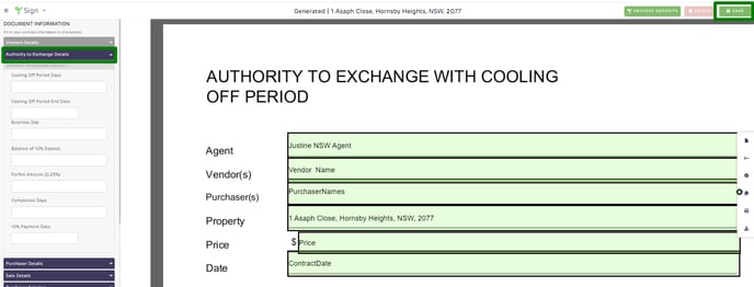 - The panel on the left provides all available fields, such as Vendor Signature, Date Signed, Text Box, Strike-through, and Tick Box.