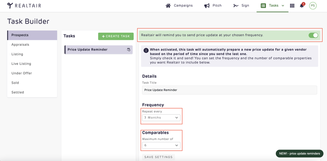 Market Update Reminders are a powerful tool to help you nurture your pipeline. When enabled, the system automatically creates a task, generates a market update with fresh comparables, and reminds you when it's time to send it.